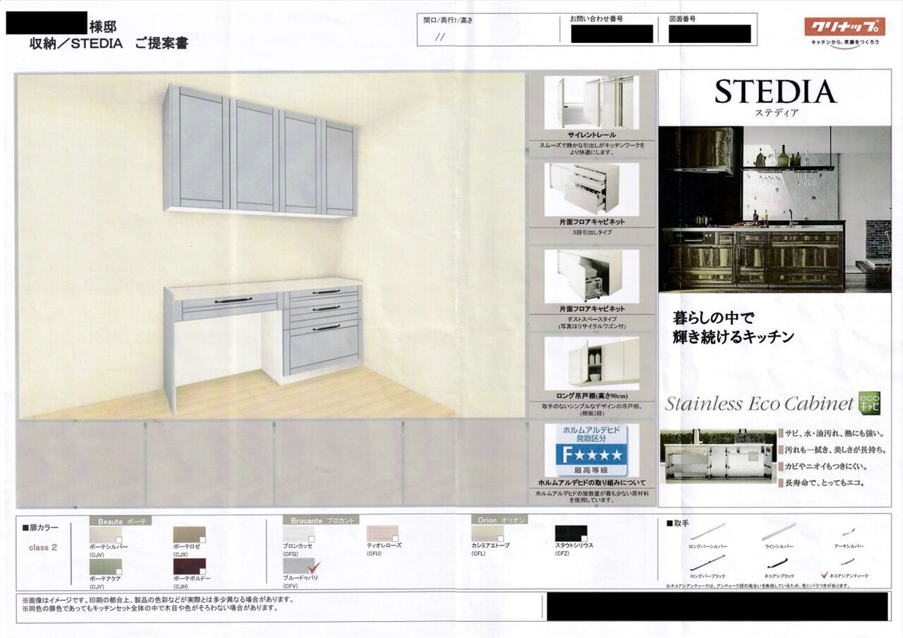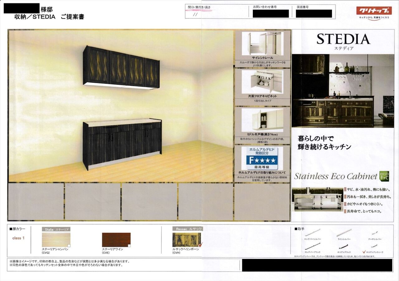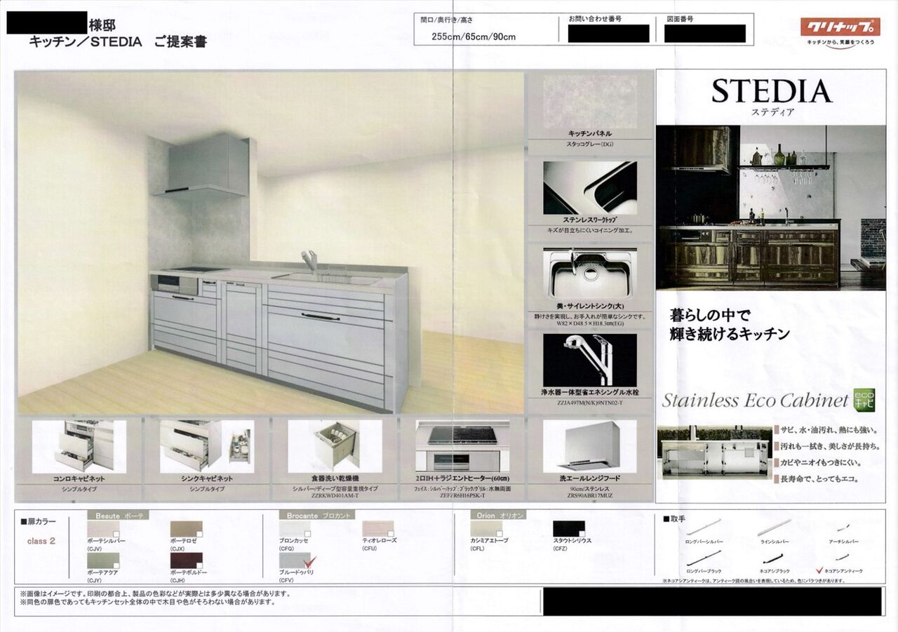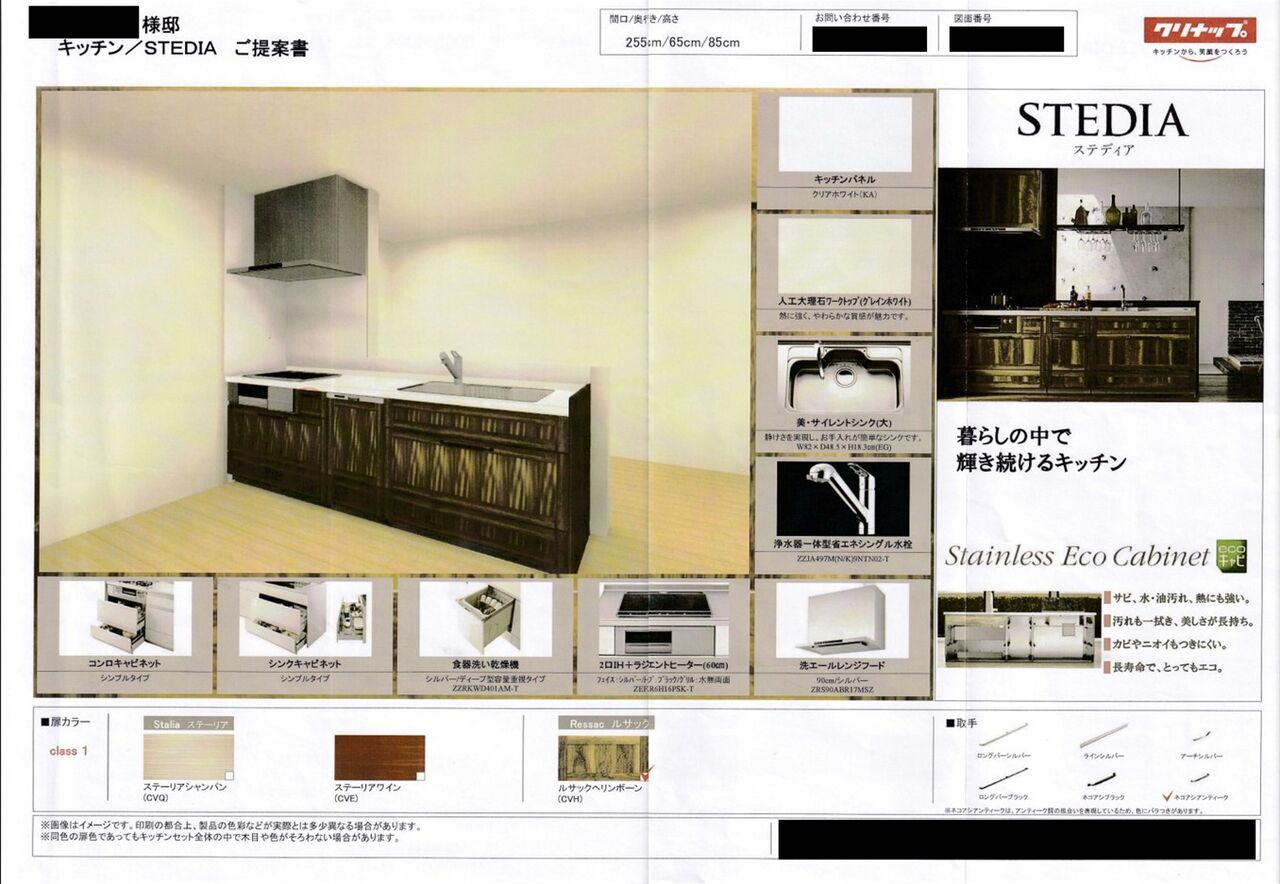 6thプランの時点で住設の提案書も付いており、キッチンは希望通りクリナップのSTEDIAとなっていました。STEDIAというのはクリナップキッチンの商品の1つです。