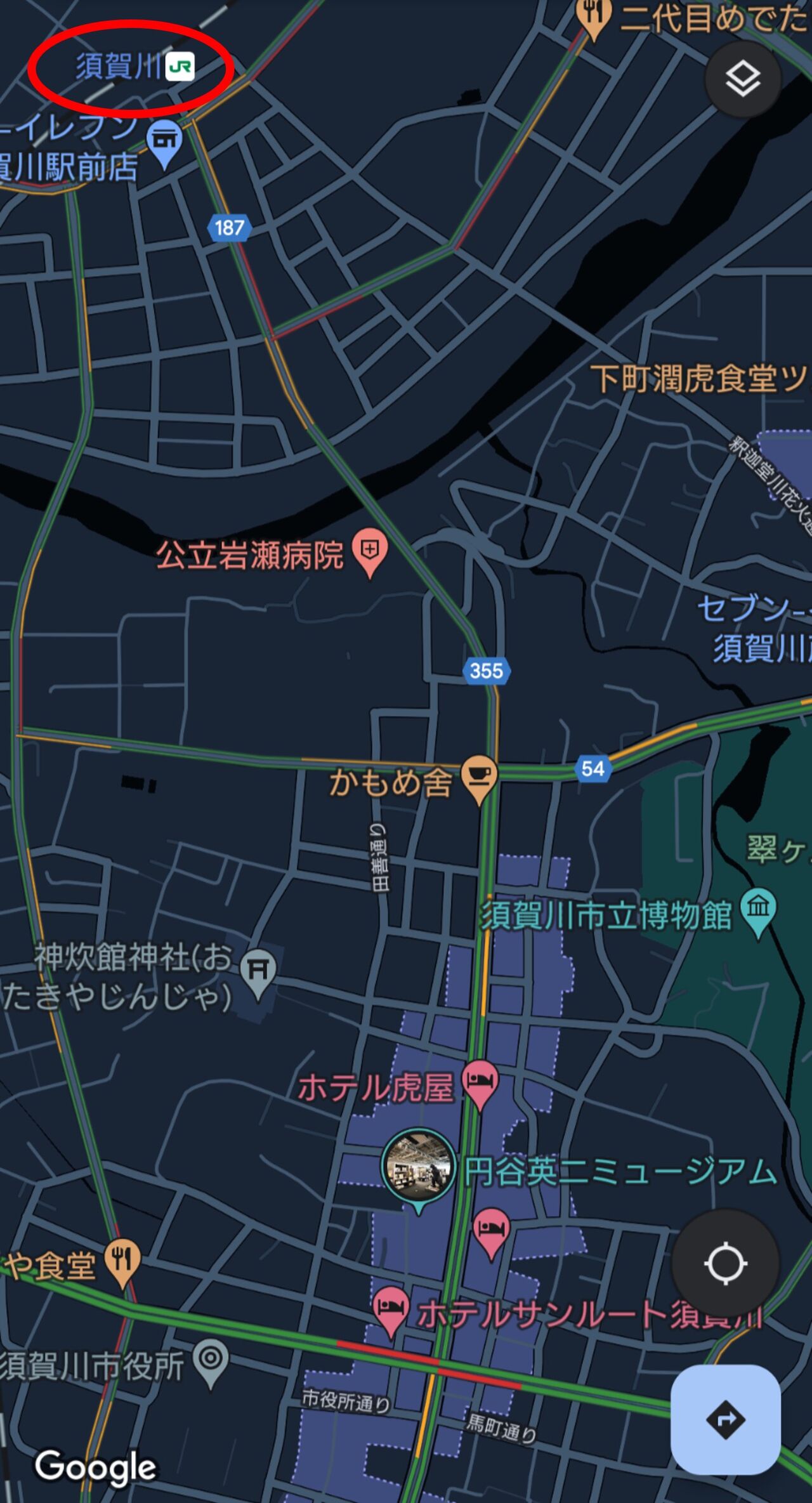 須賀川中心部の松明通りは、須賀川駅からまっすぐ延びる県道355号です。下の地図で見ると左上に須賀川駅があり、そこから画像中央を南に延びる道路ですね💡
