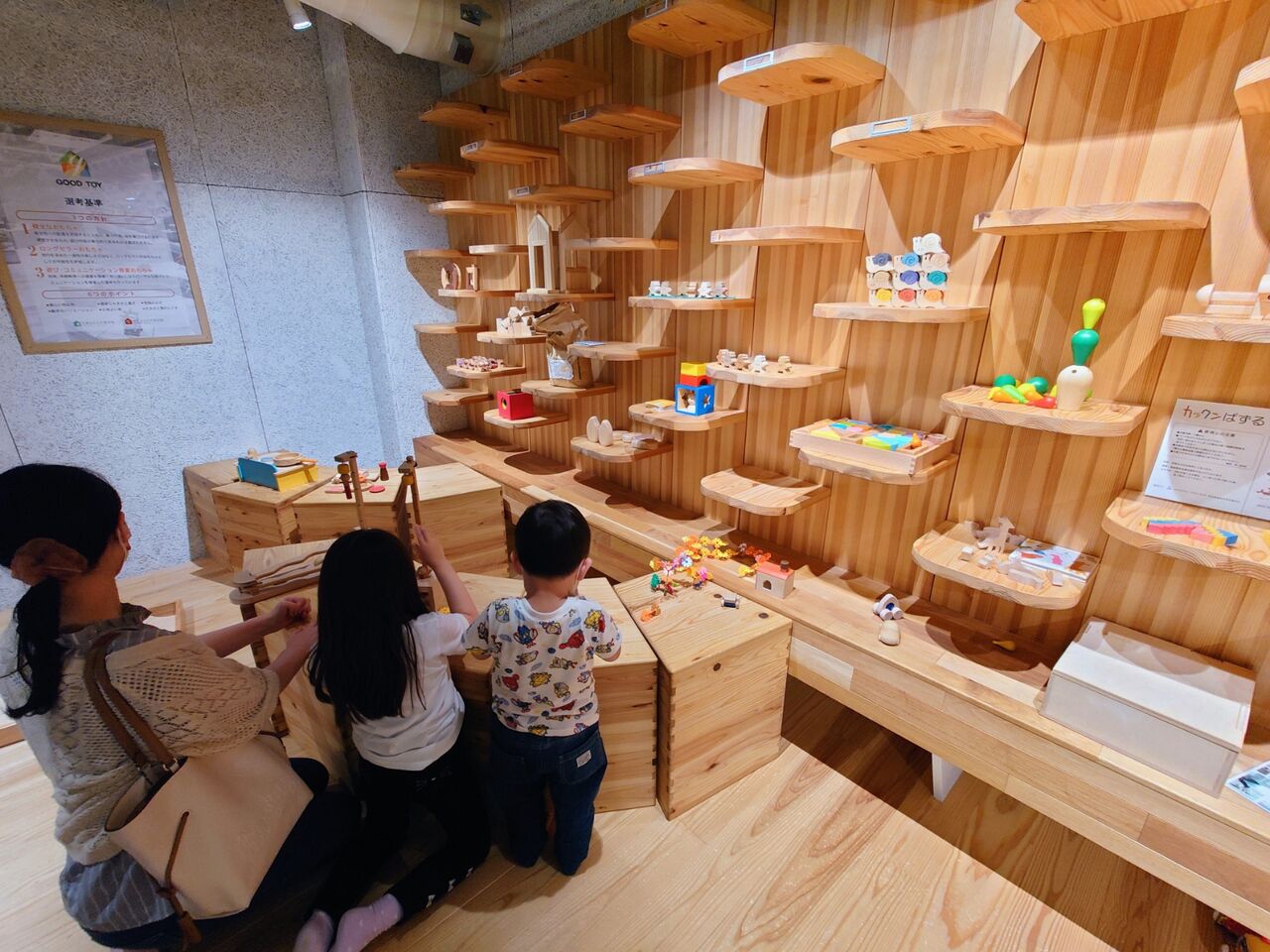木で作られたおもちゃが展示してあり、実際に手に取って遊ぶことが出来ます🤗