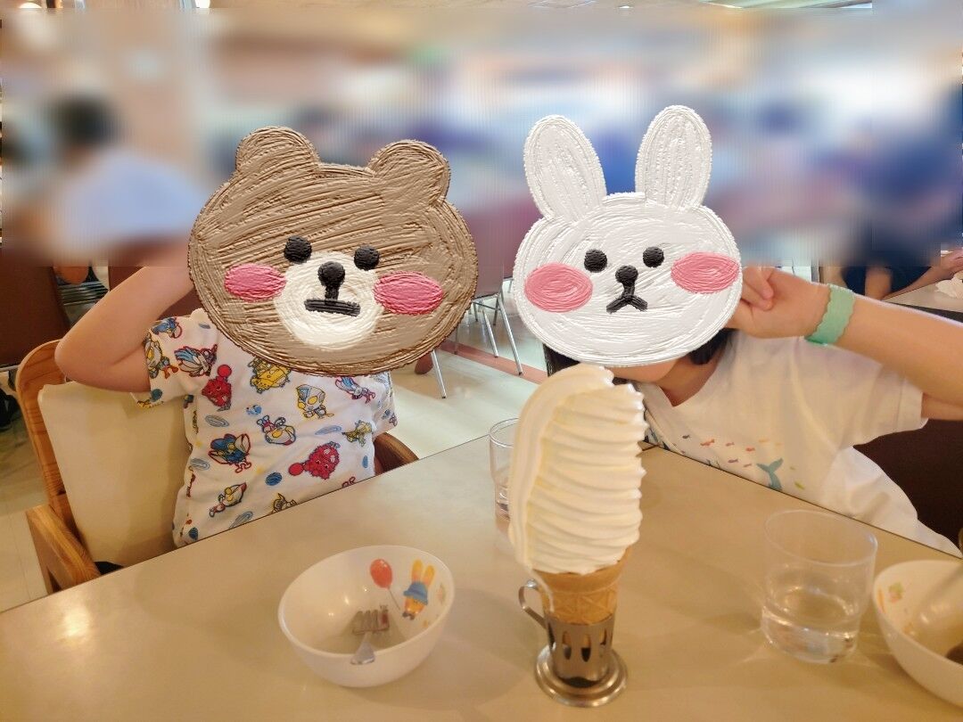 学生時代は一人で1本のソフトクリームを食べられたものですが、私達は歳を取ったし子供達はまだ若すぎるので、四人で1本のソフトクリームを頼むことにしました🤗