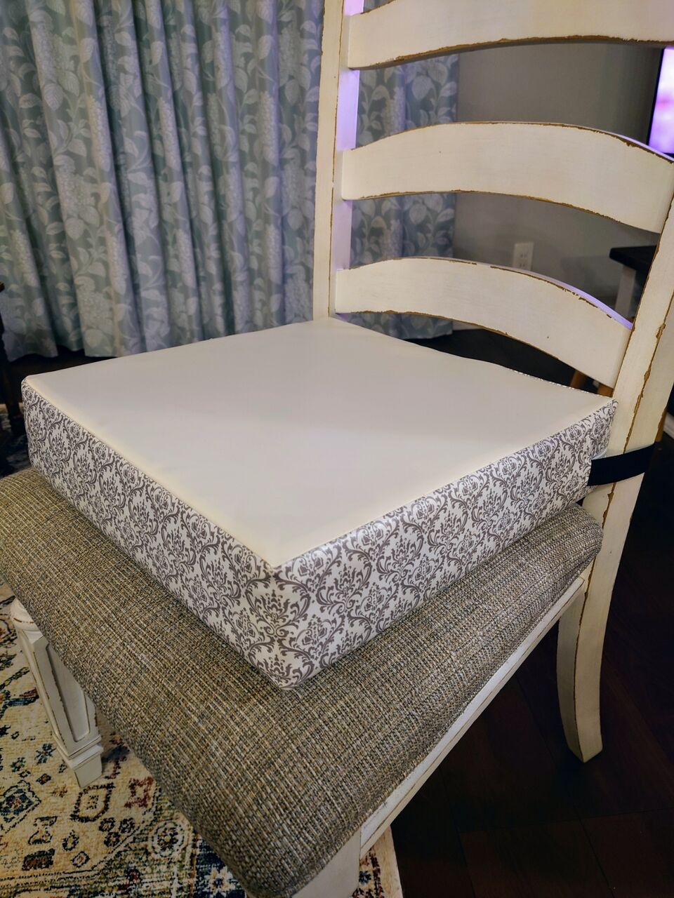 このクッション、ベルトでだいたいどんなダイニングチェアにもつけられるし、撥水なので汚れもすぐ拭き取れるし、中に厚さ3cmのウレタンクッションが3枚入っているので高さ調節も出来るんですよね✨
