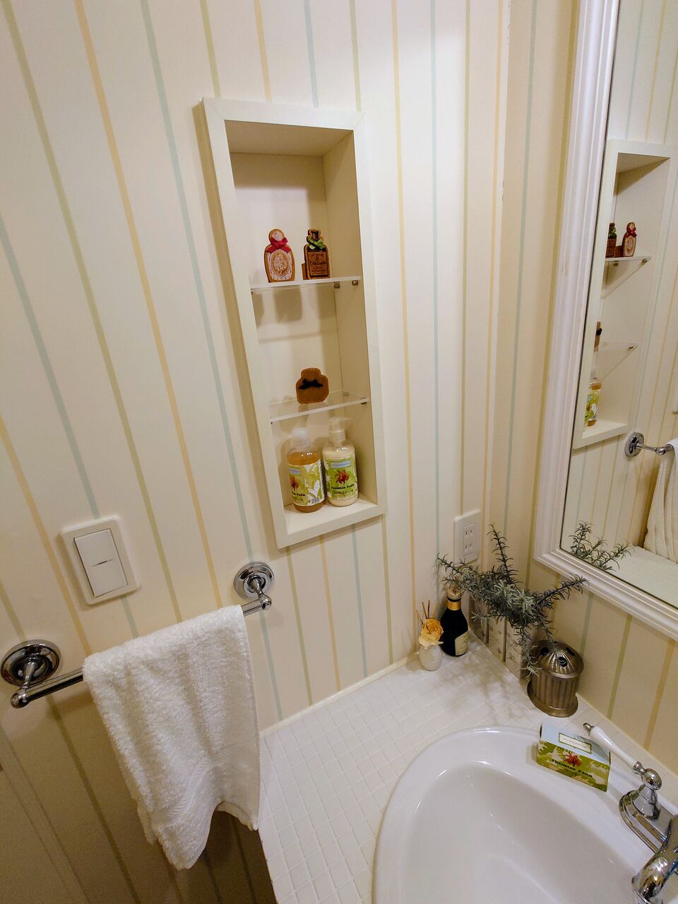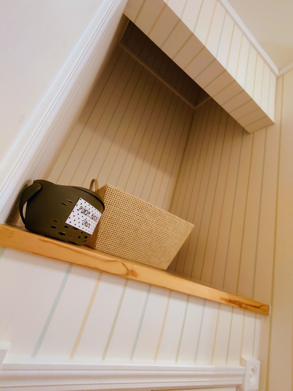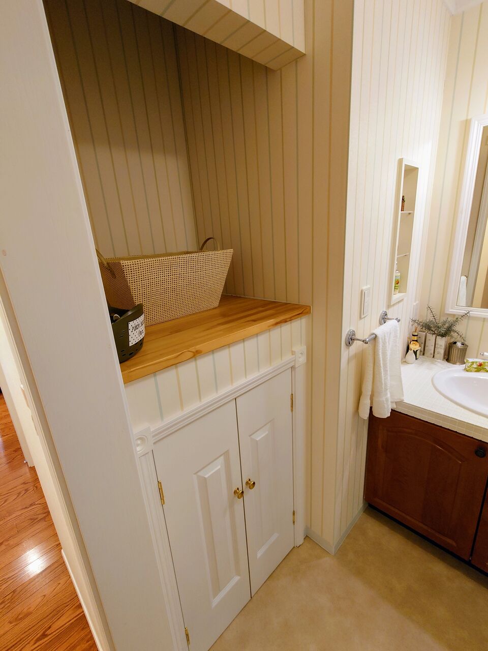 入ってすぐ左手に収納があり、その上が台になっていますね🤗