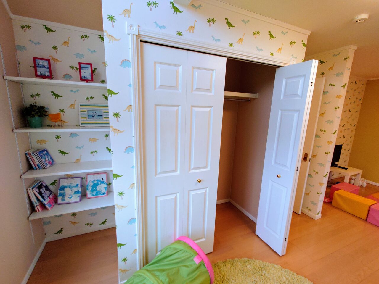 キッズスペース側の部屋の収納は2枚扉クローゼット+1枚扉クローゼットでしたが、コチラ側は1枚扉クローゼットの代わりに可動棚が付いていますね💡