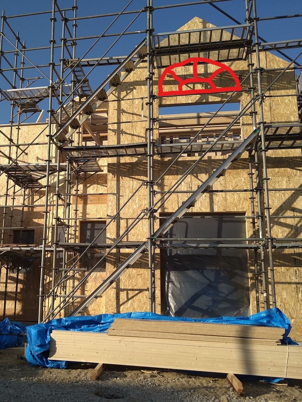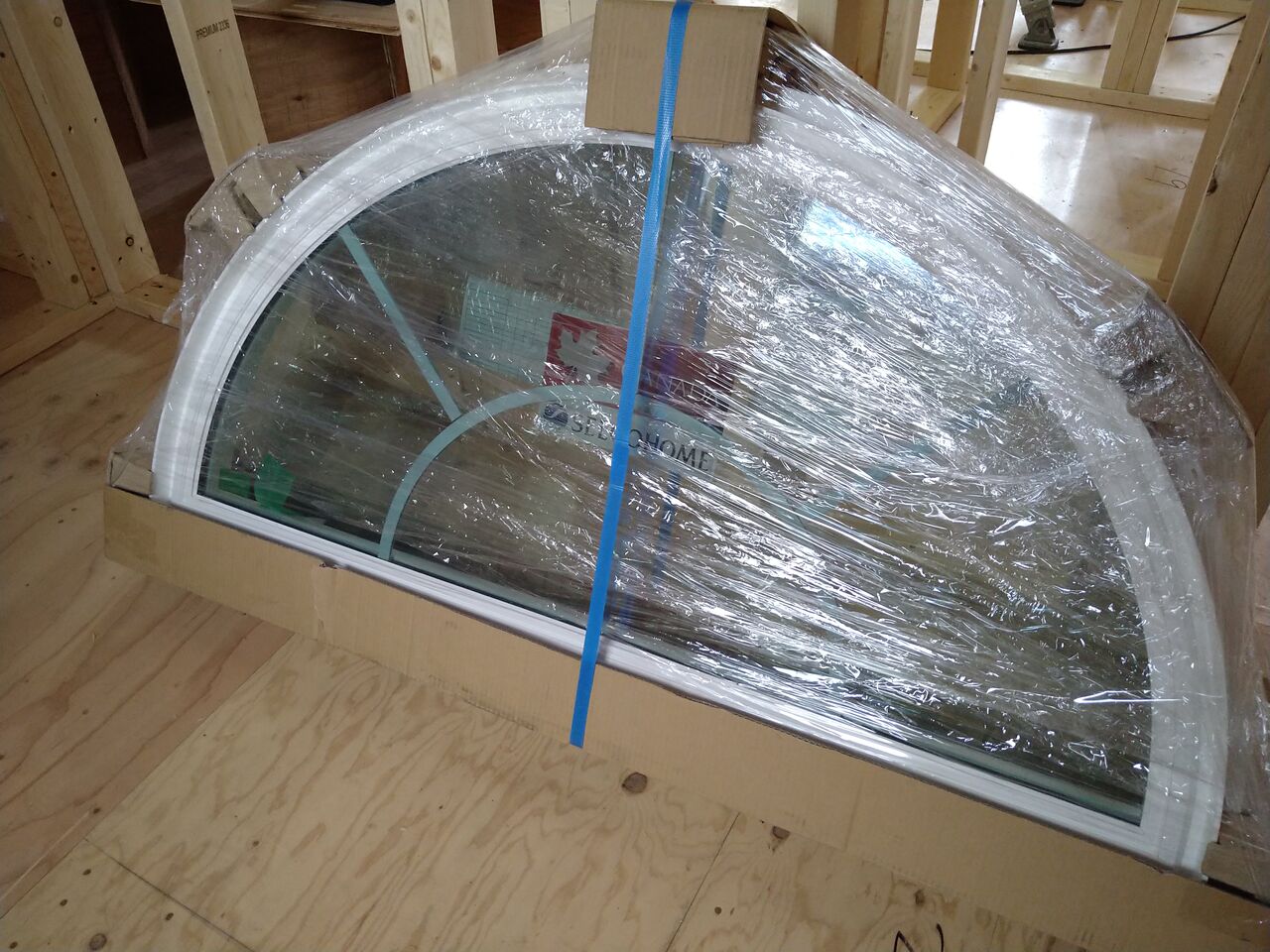 中の様子は前回記事の写真とほぼ同じでしたが、リビング吹き抜け上部に取り付け予定のハーフラウンドウィンドウ(半円窓)が置いてありました。